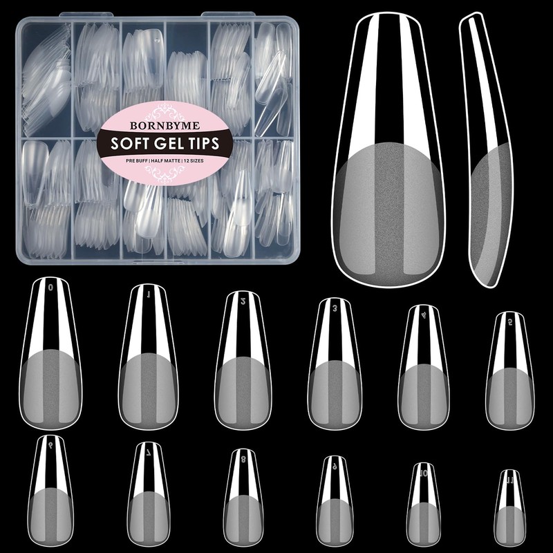 Long Coffin Soft Gel Nail Tips, BORNBYME 240 PCS Pre Buff Full Cover Shaped Nail Extenison Tips Half Matte Gel X Nail Tips