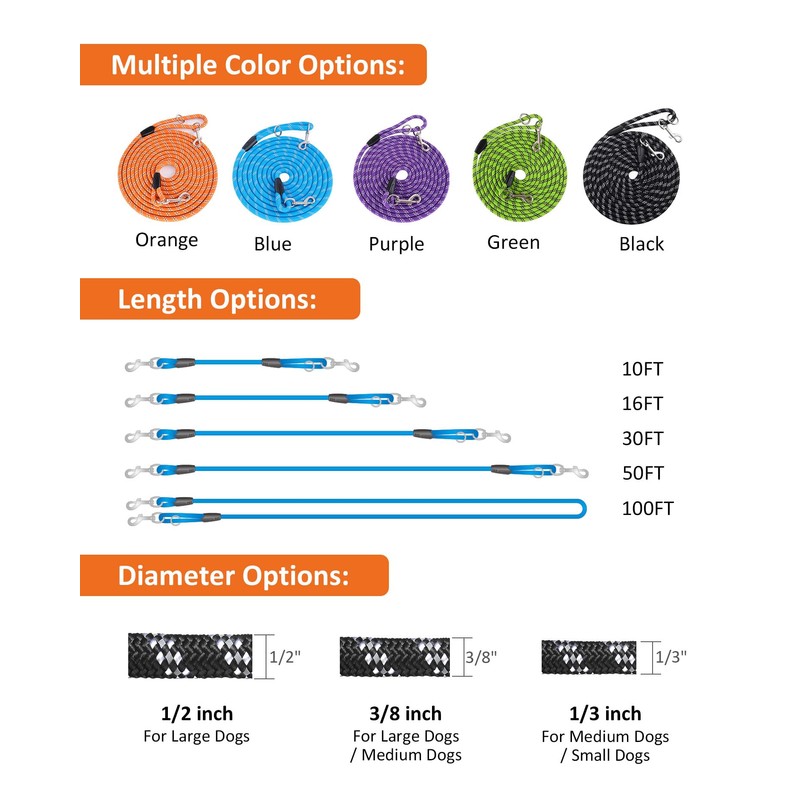 - Various Size&Dia. Long Dog Leash: 10FT, 16FT, 30FT, 50FT,and 100FT , various sizes can meet different training purpose. Our Dog Leash available in diameter 1/3 inch, 3/8 inch, 1/2inch. The diameter of 1/3 inch can meet small dogs, cats or other small animals. The diameter of 3/8 inch and 1/2 inch is the best choice for training leashes for large dogs or medium dogs.