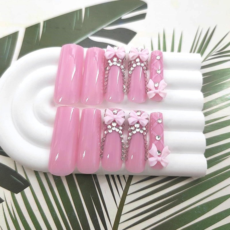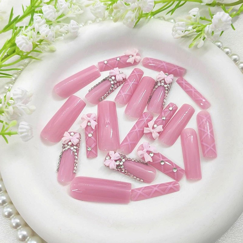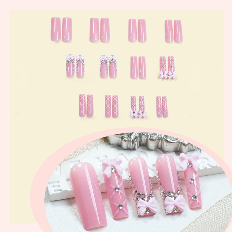 Long Press on Nails Square Fake Nails with Bow Rhinestones Lines Designs Glossy Glue on Nails Pink Full Cover Reusable Stick on Nails for Women 24 Pcs