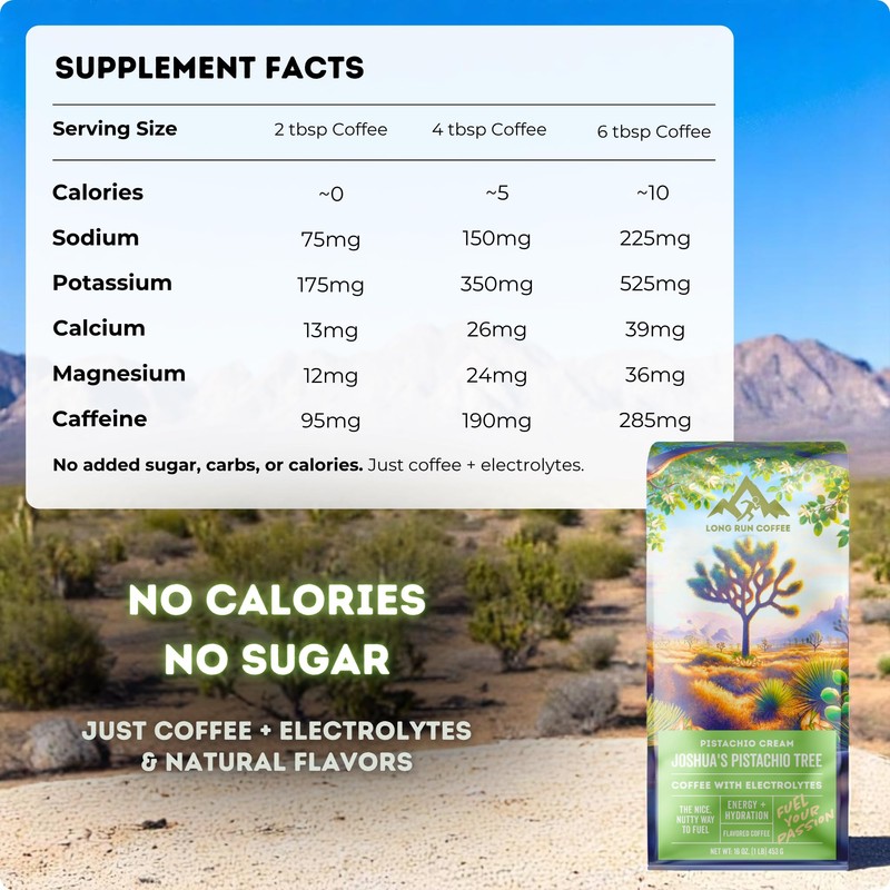 - ALL NATURAL HYDRATION + ENERGY - Long Run Coffee is a premium, organic coffee infused with essential electrolytes (potassium, magnesium, calcium, and sodium) to give you all natural energy and help you fuel, hydrate, perform, and recover. Each serving of our electrolyte coffee has roughly 95mg of caffeine and 275mg of essential electrolytes. No sugar. No calories. No artificial ingredients. Just coffee and electrolytes, plus natural flavors (if purchasing a flavored roast).