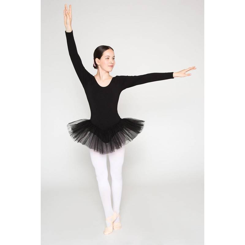 The long-sleeved tutu with round neck and back neckline brings ballerina joy even on cold days or in the cool practice room. The skirt consists of 3 layers of protruding tulle. The top layer is sewn on the jersey with visible seam with pointed arch at the front. The tulle skirt stands out the more the better the jersey fits (so do not buy too big).