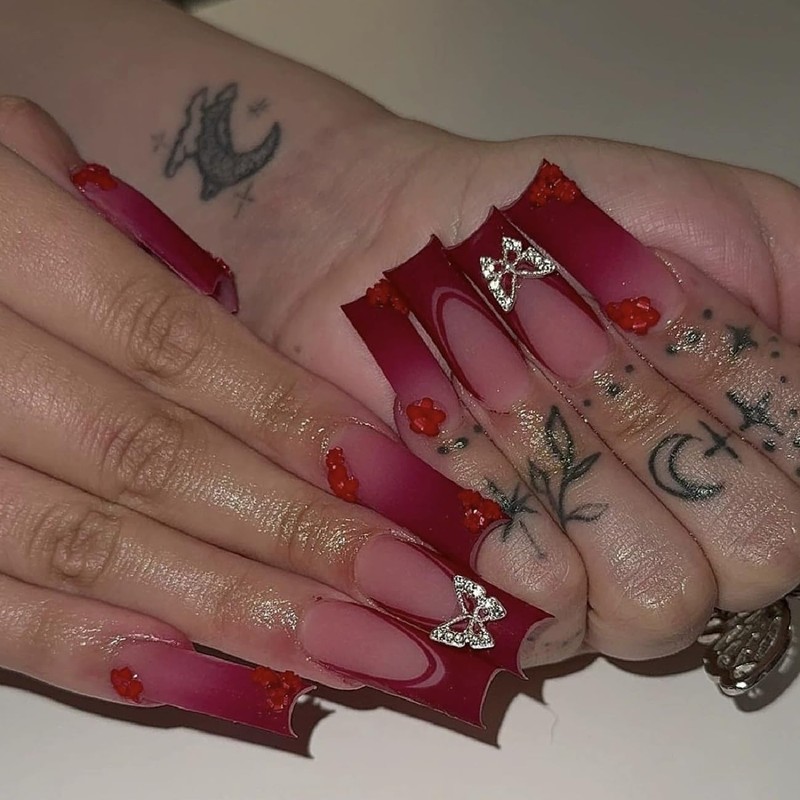 - Gorgeous and Eye - Catching Design:Our long square press on nails feature a classic red French tip, adding touch of elegance sophistication. The real show stoppers are the 3D butterfly nail charms. These meticulously crafted butterflies bring sense whimsy charm, making your stand out in any crowd. Whether you're attending romantic date, special event, or simply want to add bit glamour daily life, these perfect choice. combination bold tip delicate creates visually stunning contrast that is sure turn heads.