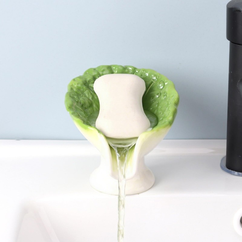 LONG XIN SERIES 1PCS Ceramic Cabbage Soap Dish Lucky Veggie Artisan Vegetable Tray with Drain Holes for Kitchen Counter Bathroom Gift Display