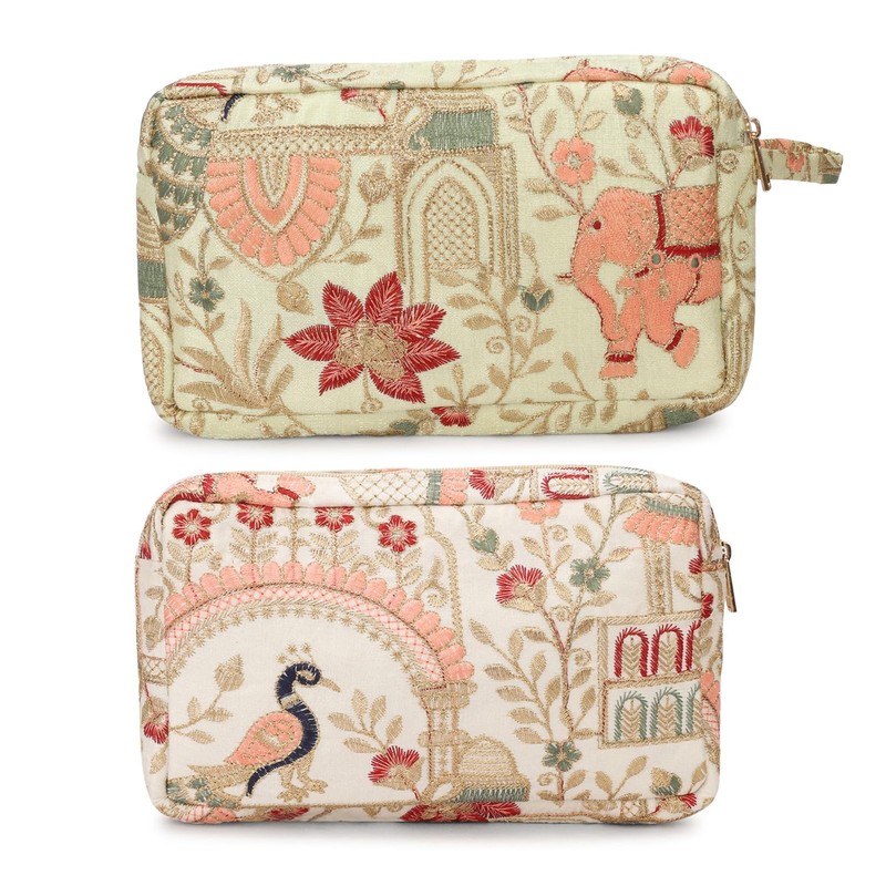 LONGING TO BUY Floral Embroidered Cosmetic Pouch, Make Up Organizer Pouch for Women, Zip Pouch Combo for Multiple Use Wristlet Design (Green & Cream)