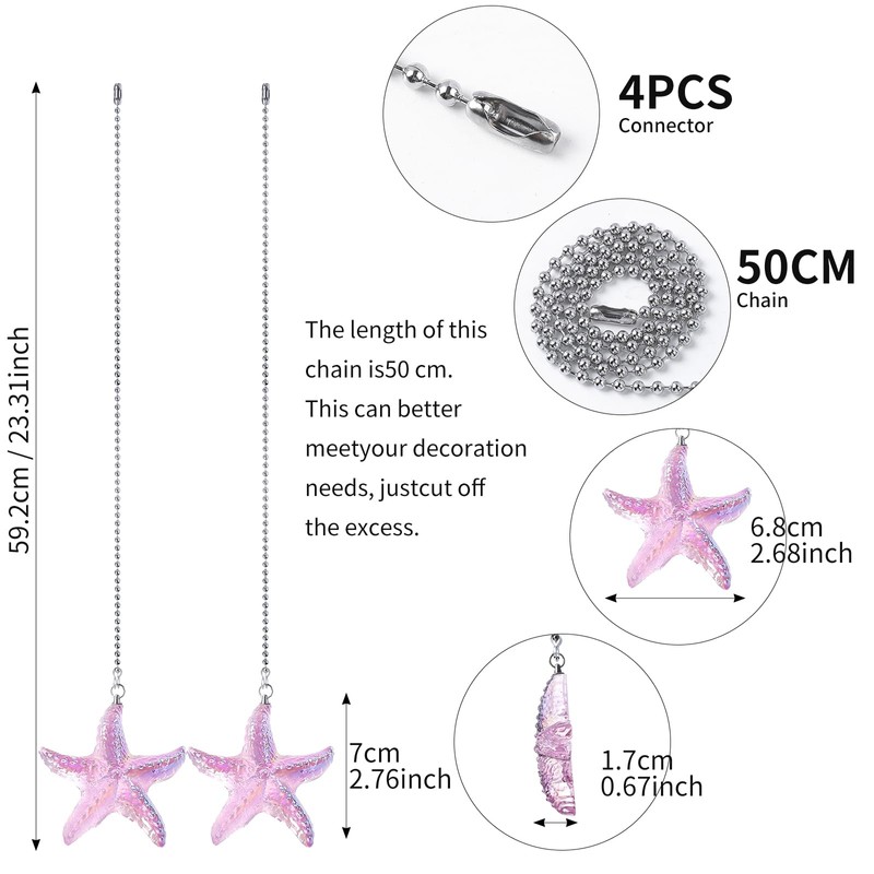 LONGSHENG - SINCE 2001 - 2 Pack Ceiling Fan Pull Chain Ornaments Extension Chains with Decorative Pink Glass Starfish 23 Inches Fan Pull Chain Set For Ceiling Light Lamp Chain