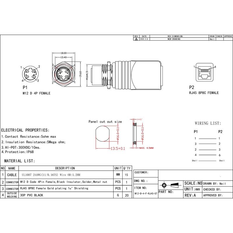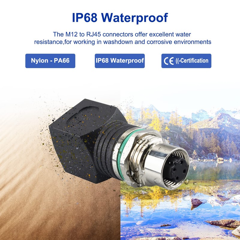 - 【M12 to RJ45】M12 to RJ45 Adapter,D-Coding,4Pin,Shielded,24AWG,IP68 Waterproof,This RJ45 M12 connector is compatible with Cat6, Cat5e, Cat5 networks, with a maximum transmission rate of 10Gb/s