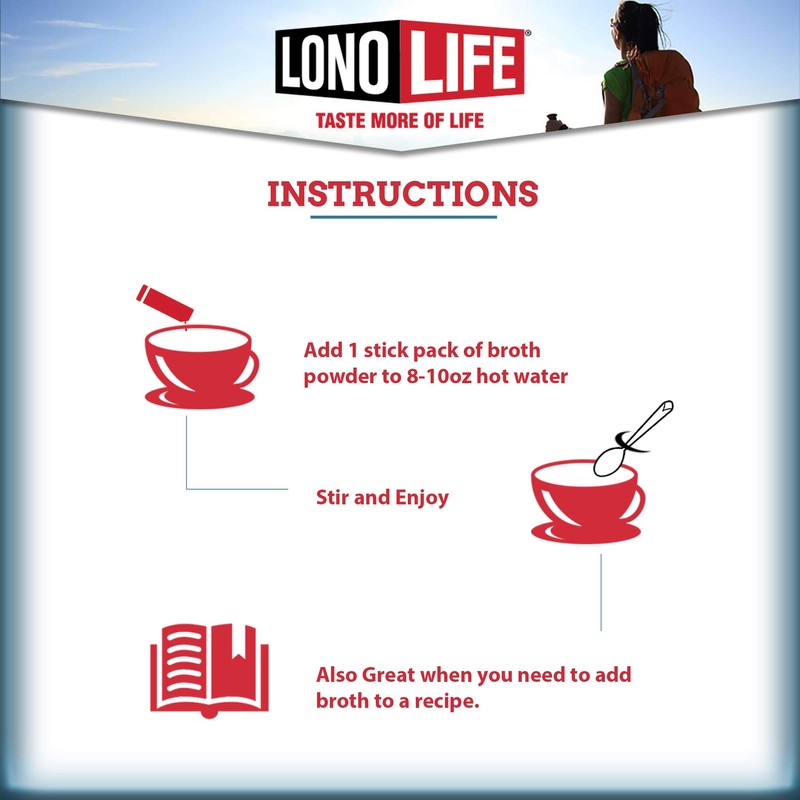- 4-pack of Stick Packs — just add broth powder to hot water, stir, and enjoy (also great when you need to add broth to a recipe.)