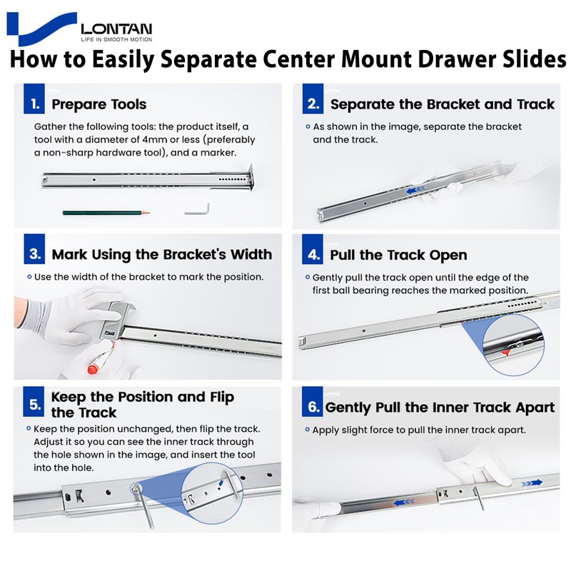 • Bottom Mounted Design:Our LONTAN center mount drawer slides are equipped with rear adjustable bracket, ensuring optimal stability and weight distribution even with heavy loads. Unlike traditional side-mounted slides, these slides offer superior durability and easy to install.