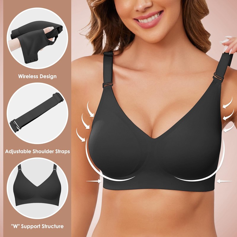 Lonya Bras for Women Push Up Seamless Non Wired Support Full Coverage Ladies V Neck Wireless Bra Comfort Adjustable Padded Zero Feel Bralettes, Black, L