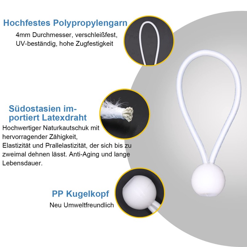 • Package Includes:25pcs Rubber Tensioners with Balls. The diameter of the tent rubber is 4 mm and the diameter of the ball 22 mm, the total length is 15 cm and can be stretched to 30 cm