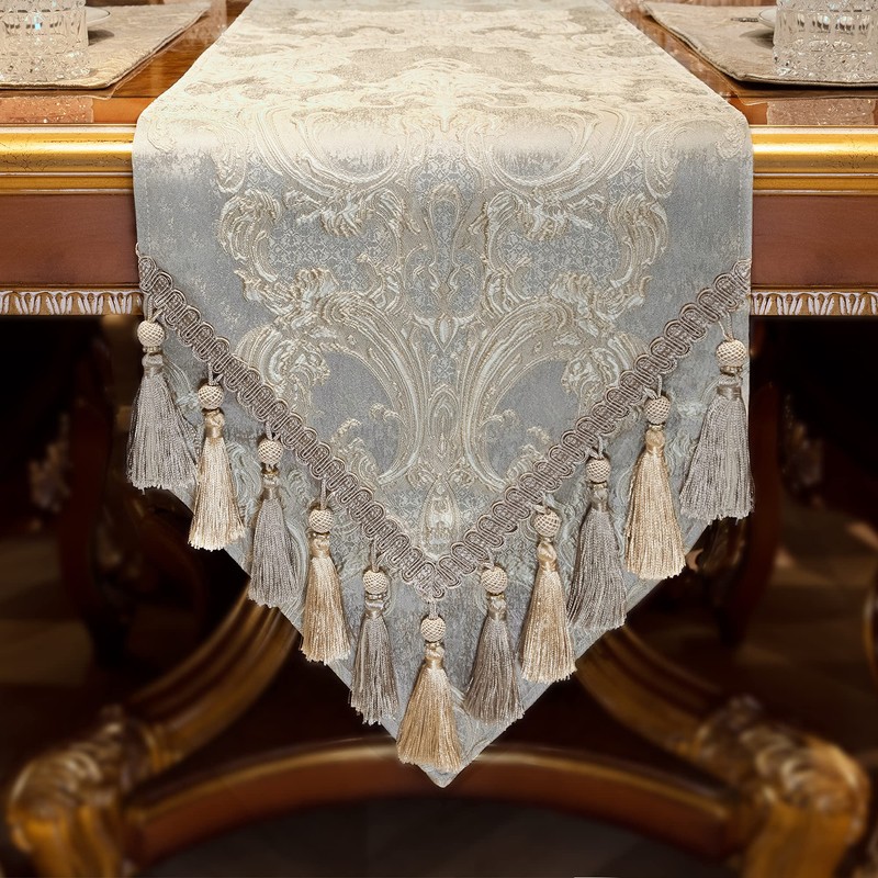 - LUXURY ELEGANT DESIGN: The chic damask pattern floats on the light gray base fabric, looks quite exquisite and three-dimensional. This stunning and gorgeous jacquard table runner features distinctive flexible tassels with shiny multi-faceted beads, showing exceptional drapability, and greatly enhancing the grade and quality of the overall home decoration.