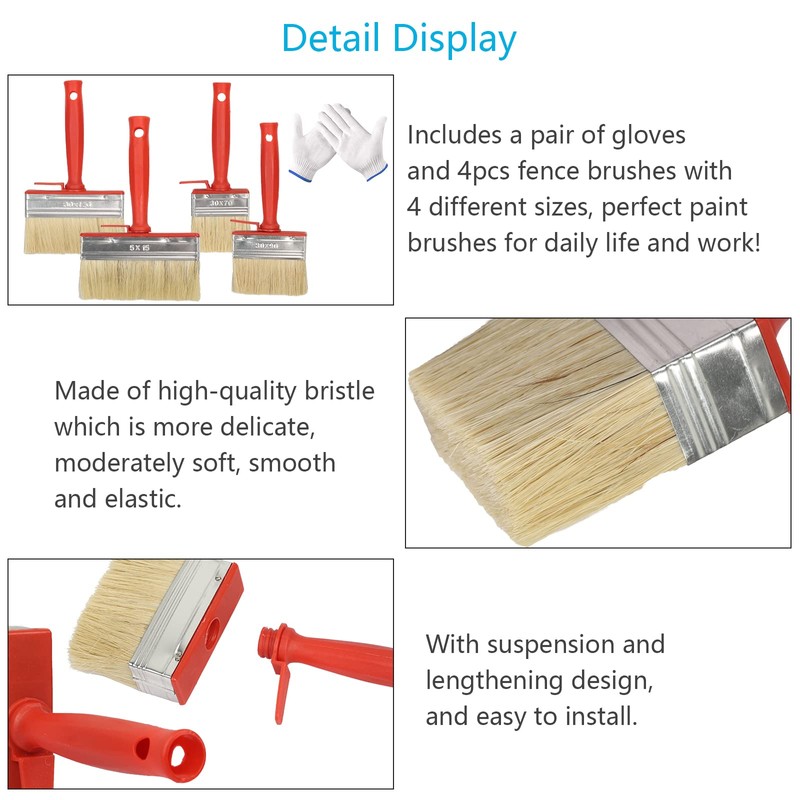 - 5-piece brush set: glaze brush set contains 1 x 70 mm glaze brush, 1 x 90 mm glaze brush, 1 x 120 mm glaze brush, 1 x 150 mm glaze brush and 1 pair of nylon gloves.