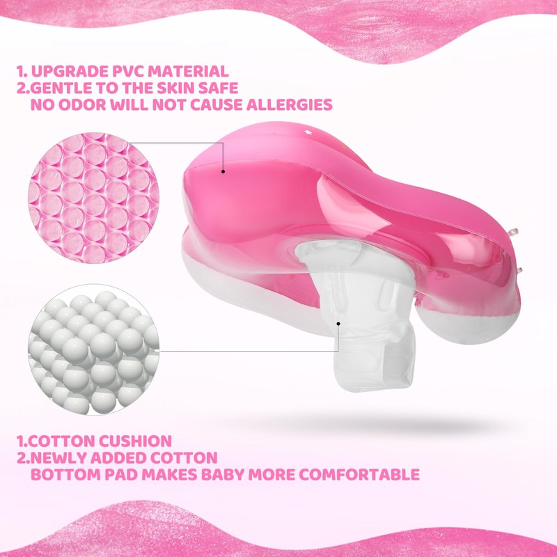 - Safe design: Equipped with a double layer air chamber, the sides are raised and widened to prevent the baby from bending forward, tipping over or slipping out. ② Two adjustable PVC straps fix the baby's position and a new outer layer prevents scratching of the skin. ③ On the belly of the swimming hoop there are two small airbags that support the baby and make it easier to play. ④ The swimming ring seat is equipped with a cotton sandwich to make it more comfortable for children to use