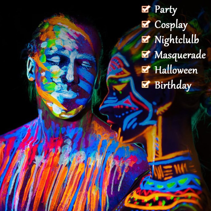 • OCCASIONS: Ideal for club events, raves, costumes, children's parties, Halloween, school dances, concerts, plays and anywhere UV rays occur. Please shake well before use