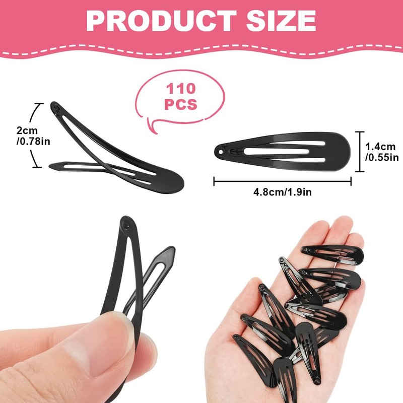 - Package Includes: The 2 inch metal snap clips set includes 110 snap hair clips, the snaps are about 2 inches long and 0.55 inches wide, small in size and light in weight, enough quantity to meet your daily use needs
