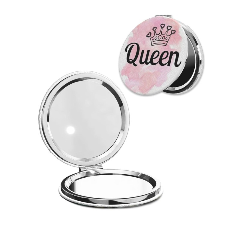 LOPIOIO Compact Pocket Mirror, 1X/2X Magnifying Round Mirror for Girls Women, Portable Pu Leather Makeup Mirror for Handbag, Purse, Travel - Crown Pink Queen