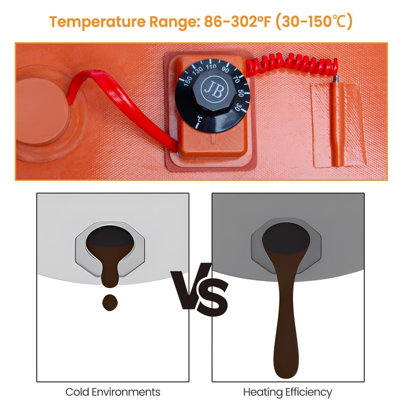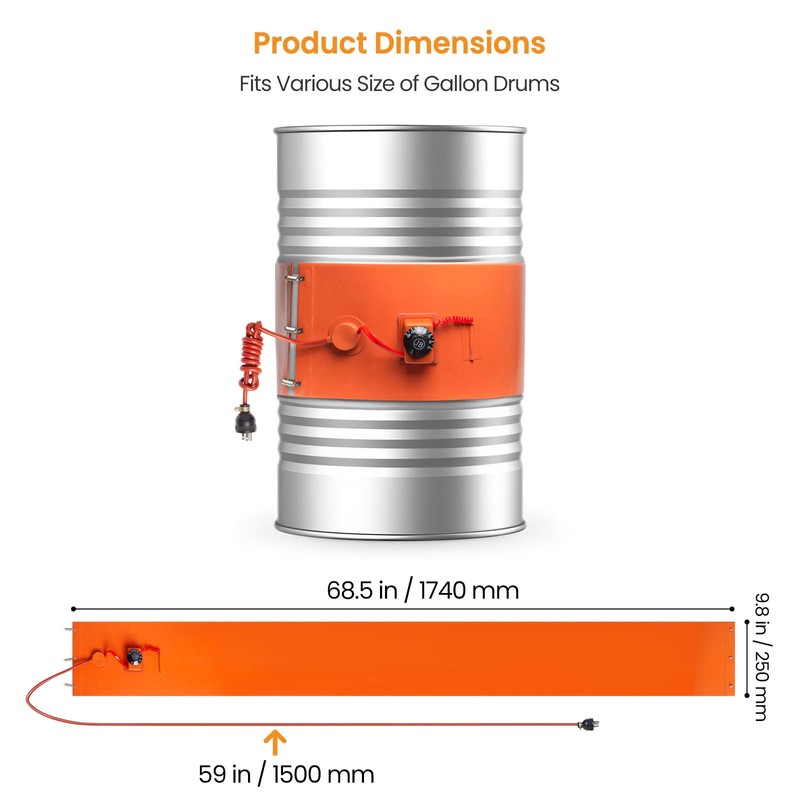 - Optimal Temperature Control for 55-Gallon Drums: Our silicone drum heater is designed to precisely regulate temperatures in 55-gallon barrels, offering a wide range from 30-150°C. This ensures materials like oils are kept at optimal conditions without the risk of overheating. Ideal for industries requiring exact temperature management, it provides consistent heat, preserving material quality.