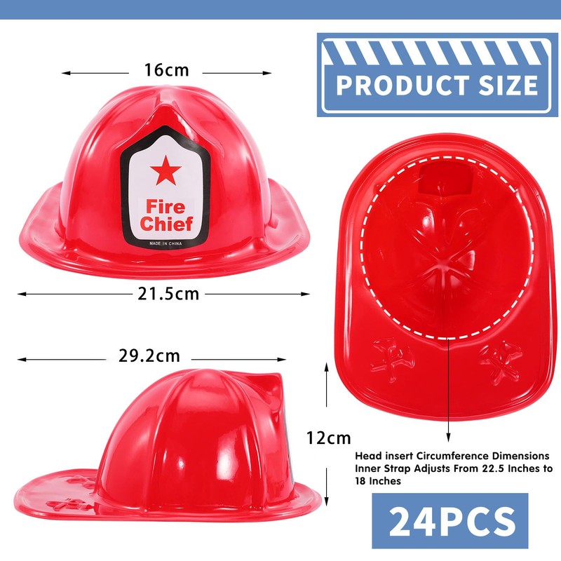 - KIDS FIRE HELMET This set includes 24 pieces identical fire brigade helmets that are enough for both daily use and parties. These helmets are ideal for role play and themed birthday parties.