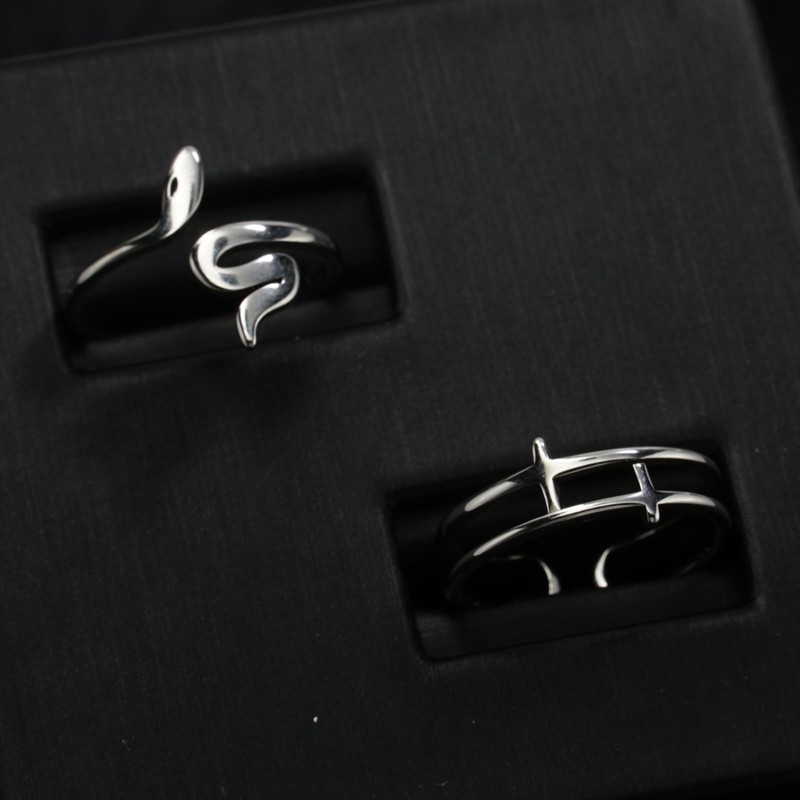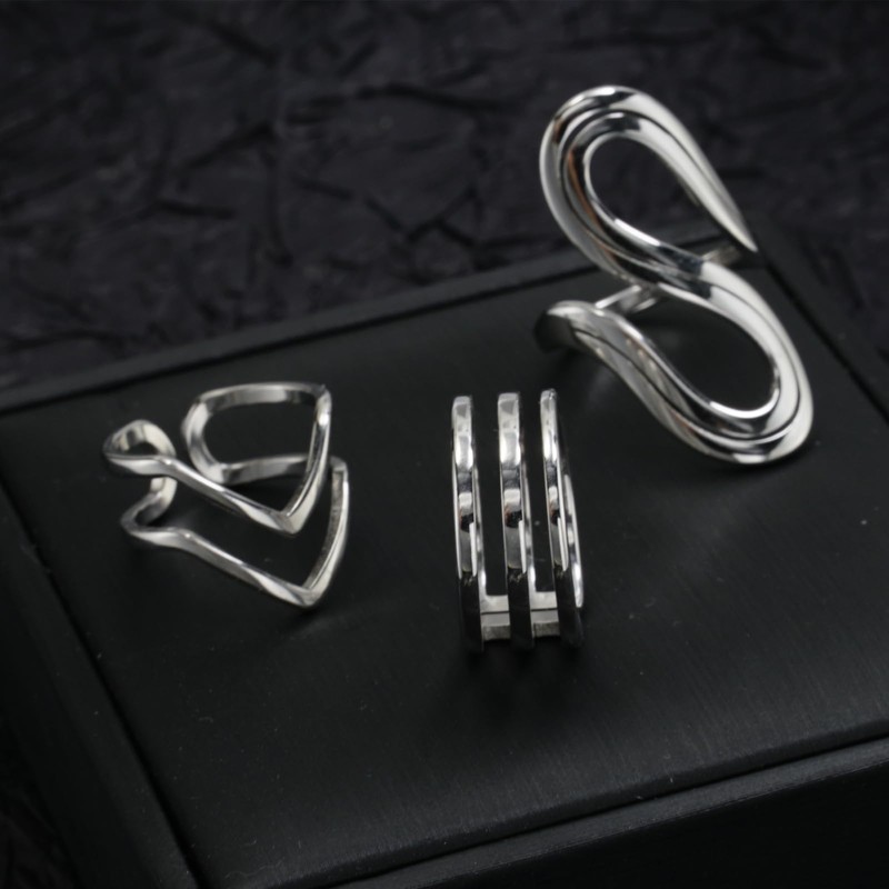 Pattern: snake, double layer criss corss, big chunky letter S, three layer rings, simple open midi rings , v rings.