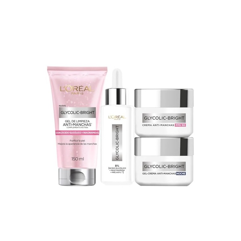 L'ORÉAL PARIS SKIN - L'ORÉAL PARIS SKIN Kit Anti-Manchas Glycolic Bright: Sérum 30ml + Crema Día/Noche 50ml + Gel Limpiador 150ml. 💎 Fórmula premium para resultados visibles y duraderos. Ingredientes naturales seleccionados y testado dermatológicamente. 🎯 Producto más buscado del mes. Ideal para quienes buscan lo mejor en calidad y estilo. Producto auténtico con satisfacción total asegurada. ¡No te quedes sin el tuyo y aprovecha esta oportunidad única!