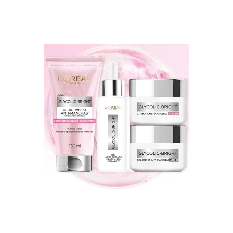 🌟 💄 L'ORÉAL PARIS SKIN Kit Anti-Manchas Glycolic Bright: Sérum 30ml + Crema Día/Noche 50ml + Gel Limpiador 150ml 💄 🌟