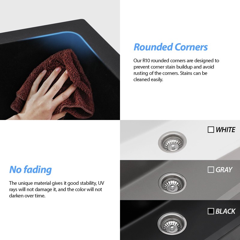 - Unique Features - The high-end material has hard, smooth, non-porous surfaces that reduce dirt and where dirt can hide, making kitchens cleaner, does not scratch and effectively protects your hands. The combination of R10 tightly rounded corners and ultra-smooth surfaces makes the sink easier to wipe clean, eliminating accumulated time.