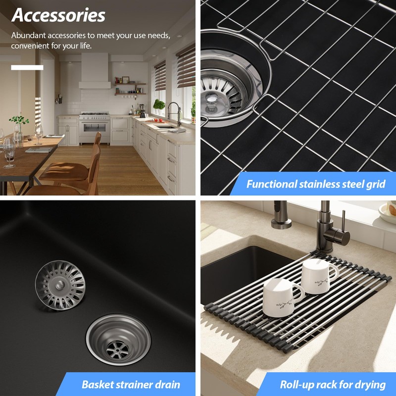 - Quiet and Bright Colors - The black granite sink is a quieter kitchen sink. The thick stone eliminates vibration and noise when using the sink. color does not fade, rich and stable colors that do not darken over time.