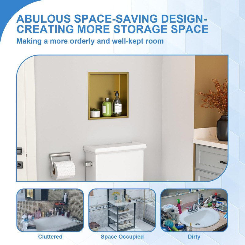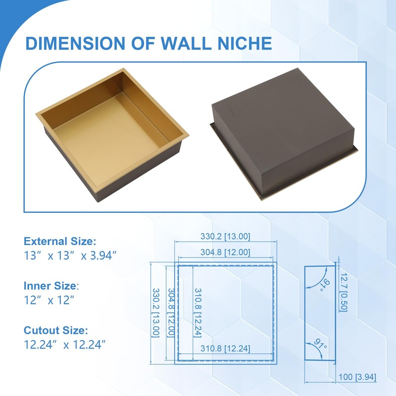 - [Lordear Bathroom Niche Size]:Inner Size: 12 inch Width x 12" inch Height. The unique design allows for storage while adding beauty to the room. Being recessed into the walls means that no valuable space is being taken up!The built-in design makes your house more neat and empty!