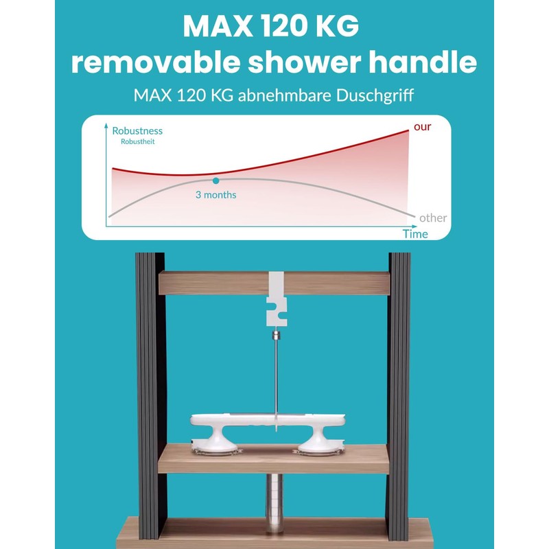 - Material needs attention: Please note do not stick to rough or uneven surfaces. It is a perfect helper for injured, the elderly and toddlers. The shower suction handle for seniors is indeed a warm gift for your family, friends and the people you loved. The strong suction cup design works on any non-porous, flat surface, including smooth tiles, glass.