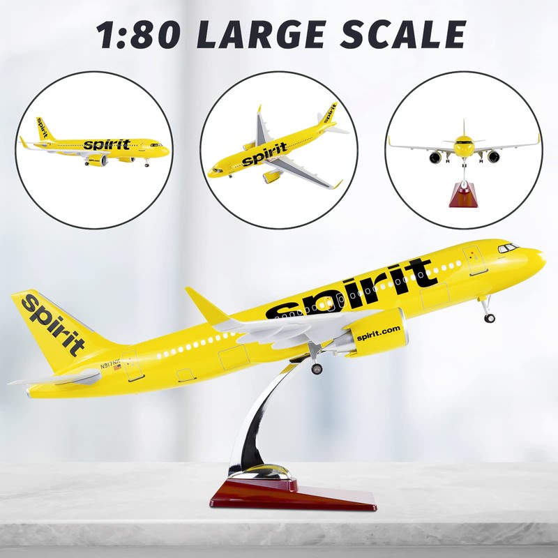 Lose Fun Park 1:80 Scale Large Airplane Model Spirit Airlines Airbus 320 Plane Model Diecast Airplanes with LED Light for Collection or Gift (Spirit Plane)