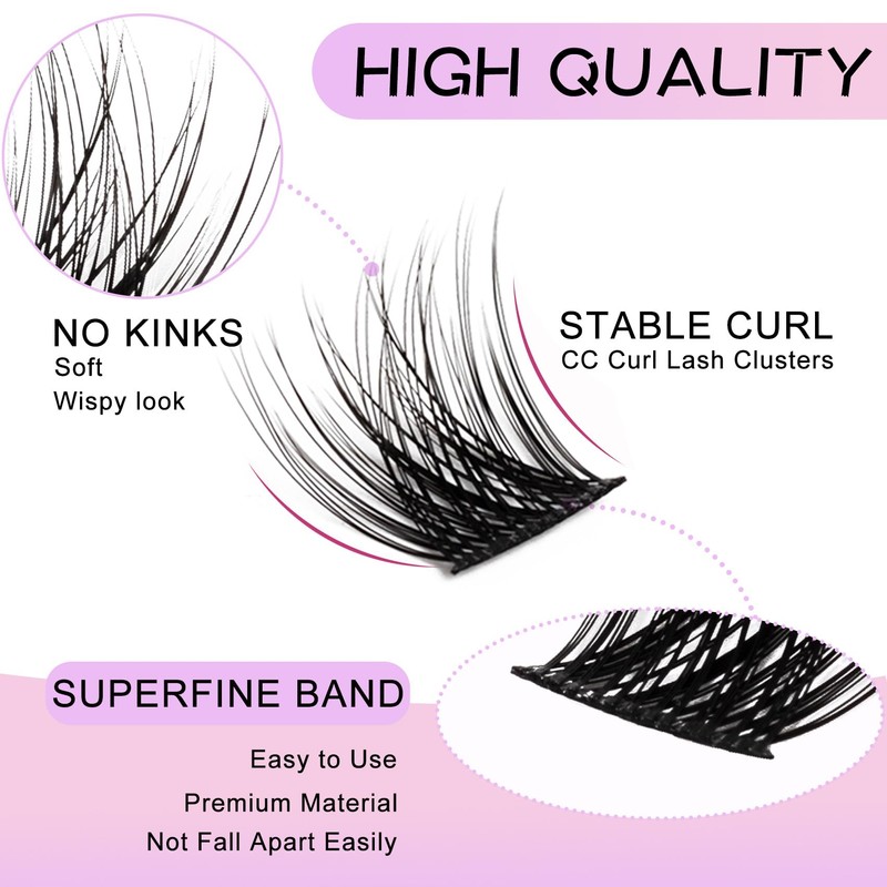 - DIY Lash Extensions: These lash clusters are CC curl and 96pcs with different length mixed, which include 8mm*16pcs, 10mm*24pcs, 12mm*24pcs, 14mm*16pcs, 16mm*16pcs. You can DIY lash extensions at home, no longer need salon to achieve it. It's more convenient to save your much money and time.