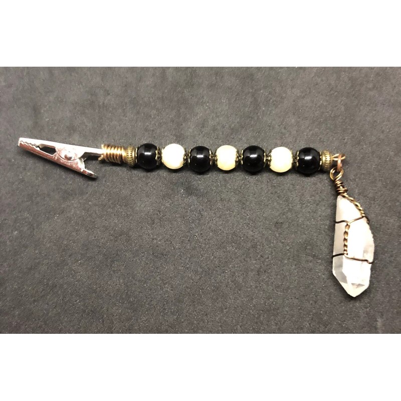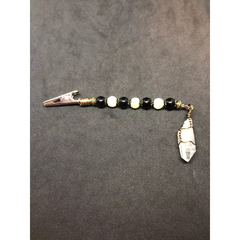 I used aragonite and onyx for this MU inspired roach clip. I added a quartz crystal charm. Quartz is a master healer and should be programmed with an intention, or wish.