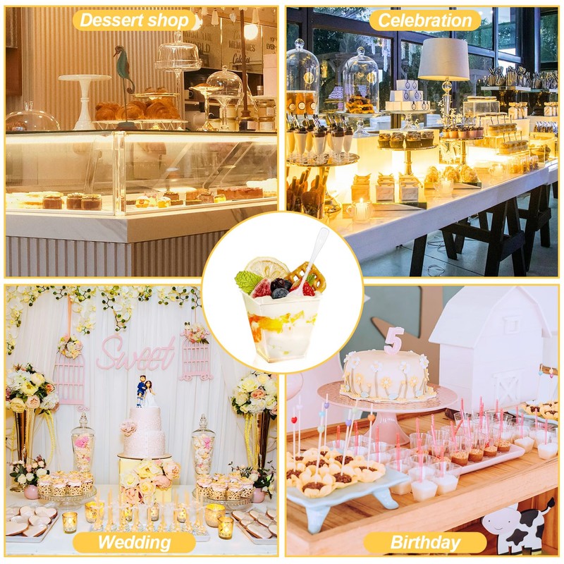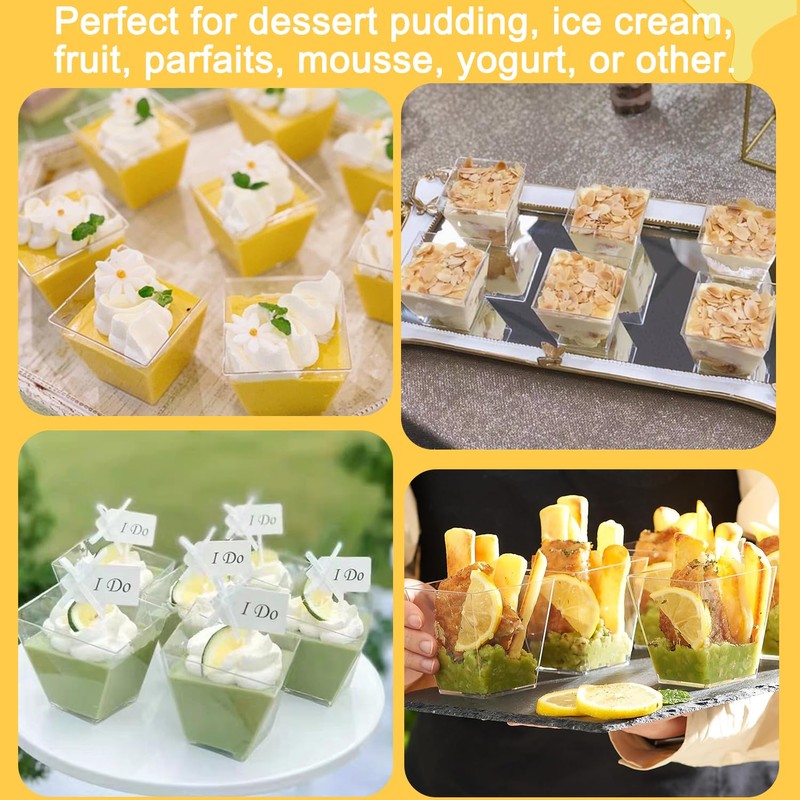 - Square design -- Unlike the traditional round cup, these clear plastic dessert cups offering a secure grip&easy stackability for efficient storage. Mini dessert cup with its captivating shape, adding a special touch of opulence to your desserts