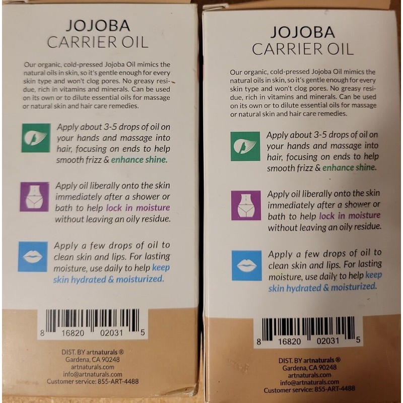 Lot of 2 Artnaturals Pure Jojoba Carrie Oil 4 oz for Face, Hair & Skin, Exp 5/22