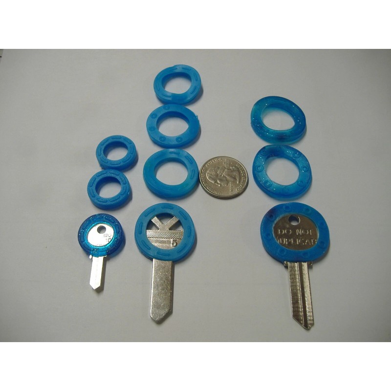 This is a brand new lot of ten piece blue colored large, medium and small identifier rings. The large key ring identifiers fit around the head of larger keys. The medium key ring identifiers fit around the head of regular size keys such as Kwikset and Schlage or other keys that are approximately the size of a quarter or smaller. The small key ring identifiers fit around the head of padlock size keys. They help identify keys even in the dark. The quarter in the photo DOES NOT come with the assortment, it is for size reference only.