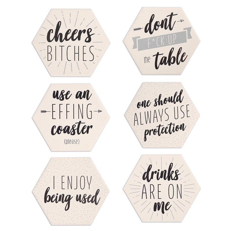 - 【UNIQUE DESIGNS】These drink coasters are printed with 6 humorous sayings, which will hilariously remind people to keep their drinks off the table. Our designs are printed on, not stickers stuck on, so it does not fade easily and can be used for a long time. The 4.2” diameter makes these suitable for most cups, mugs and bowls. A great accessory for your home, kitchen, living room, college dorm room, man cave, bar, etc.