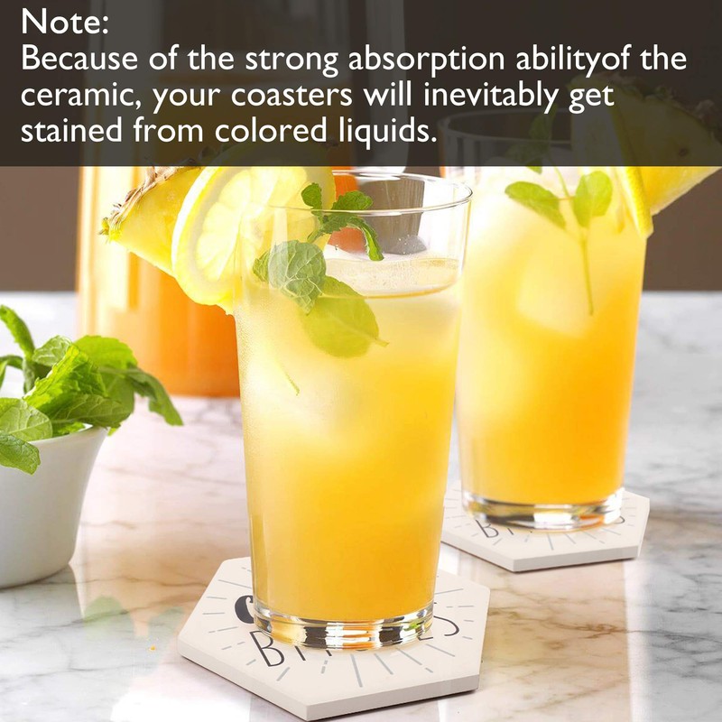 - 【NOTE】Because of the absorbent nature of the ceramic, your coasters will inevitably get stained from colored liquids. If that happens, we recommend soaking them in warm water with dish soap overnight, to try lessen the appearance of the stain