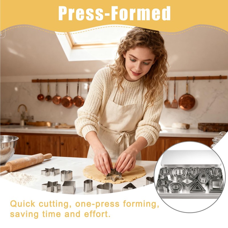 - Easy Storage & Quick Cleanup: Includes a sturdy tiered storage tin (30-piece capacity) to organise cutters layer-by-layer – no more tangled shapes! Hand-wash recommended for longevity, though dishwasher-safe.