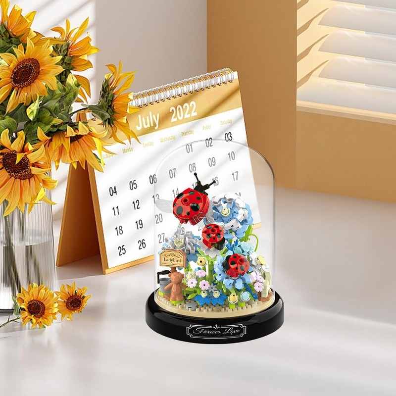 Lotvic Flower Building Blocks Set, 596 Pieces Seven Point Ladybird Flowers Micro Mini Building Block Set with Dustproof Dome and Base, Artificial Plants Building Blocks for Adults, Home Decoration
