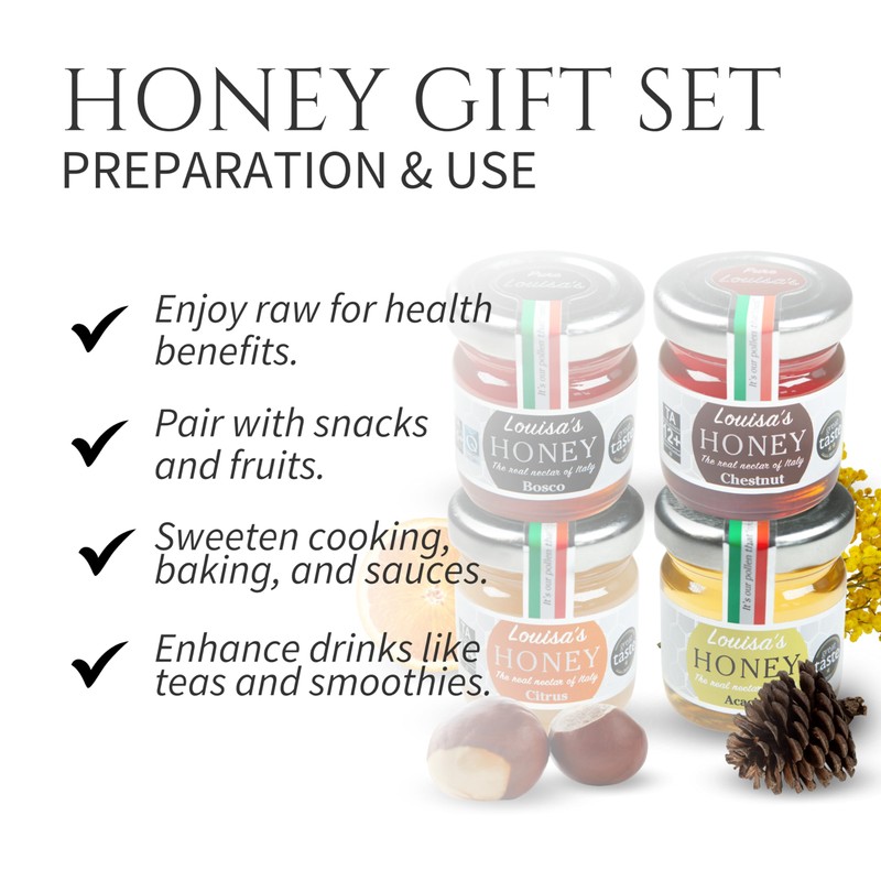 • LUXURIOUS ITALIAN HONEY GIFT SET: A premium selection of 4 x 50g raw, pure, and sustainably sourced Italian honeys - perfect for honey enthusiasts and gifting.
