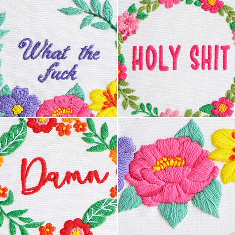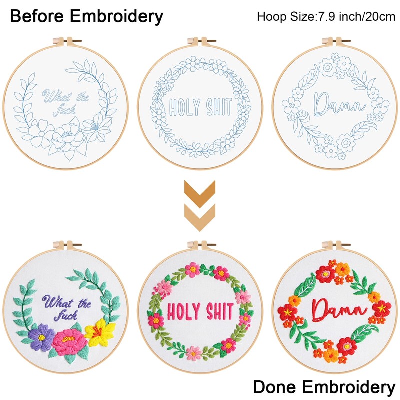 - Funny cute words pattern:There are 3 sets funny words and floral wreath stamped on the embroidery cloth,which will provide great help for Embroidery beginners