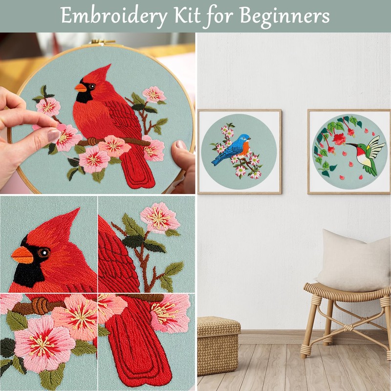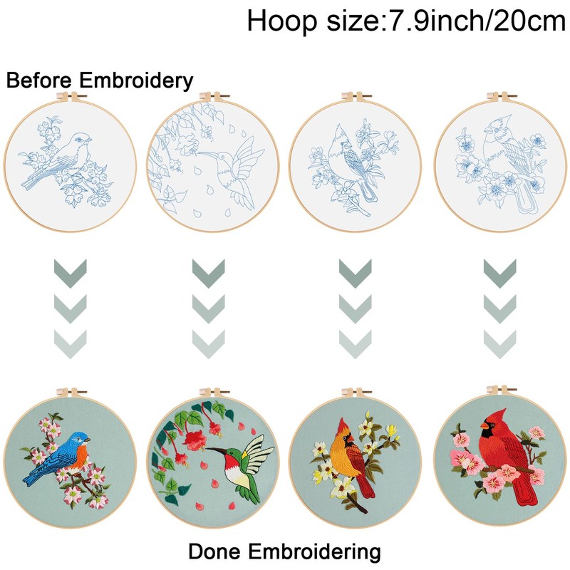 - Spring birds pattern:There are 4 cute hummingbird cardinal and floral pattern on the embroidery cloth.Notice:The pattern is made of special ink, meet the water will disappear, do not touch water before you finish embroidery