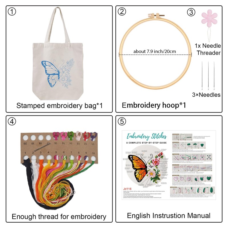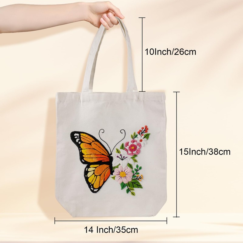- Value canvas tote bag embroidery kit include:The embroidery kit includes 1 canvas bag with a beautiful pre-drawn pattern, 1 needle threading devices,1 7.9inch embroidery hoop, an embroidery instruction, 2 embroidery needles and enough thread