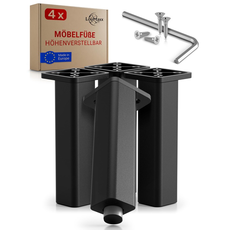 LouMaxx Adjustable Furniture Feet - Set of 4 38 x 38 x 150 mm in Black Including Mounting Plate - Feet for Cabinets Suitable as Kallax Feet - High-Quality Cabinet Feet for Individual DIY Furniture