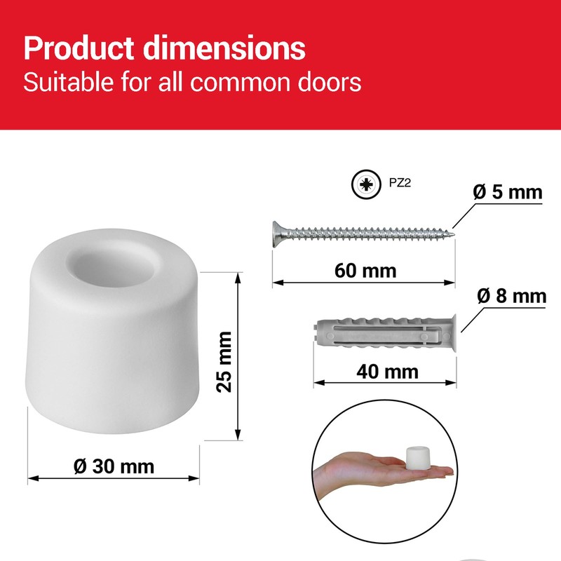 - PACKAGE CONTENT: Set of 3 rubber door stops, including screws and dowels; Dimensions: 30x25 mm; Color: white.