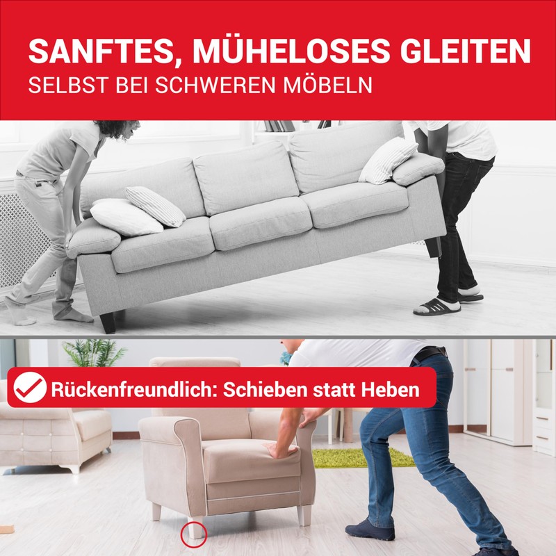 • ✔️ Versatile application: even heavy pieces of furniture, objects or kitchen appliances can be easily moved thanks to the Teflon gliders thanks to their low friction resistance. For cleaning floors and surfaces, large flower pots, food processors or shelves can be moved comfortably, easily and gently on the floor with the help of the Teflon gliders.