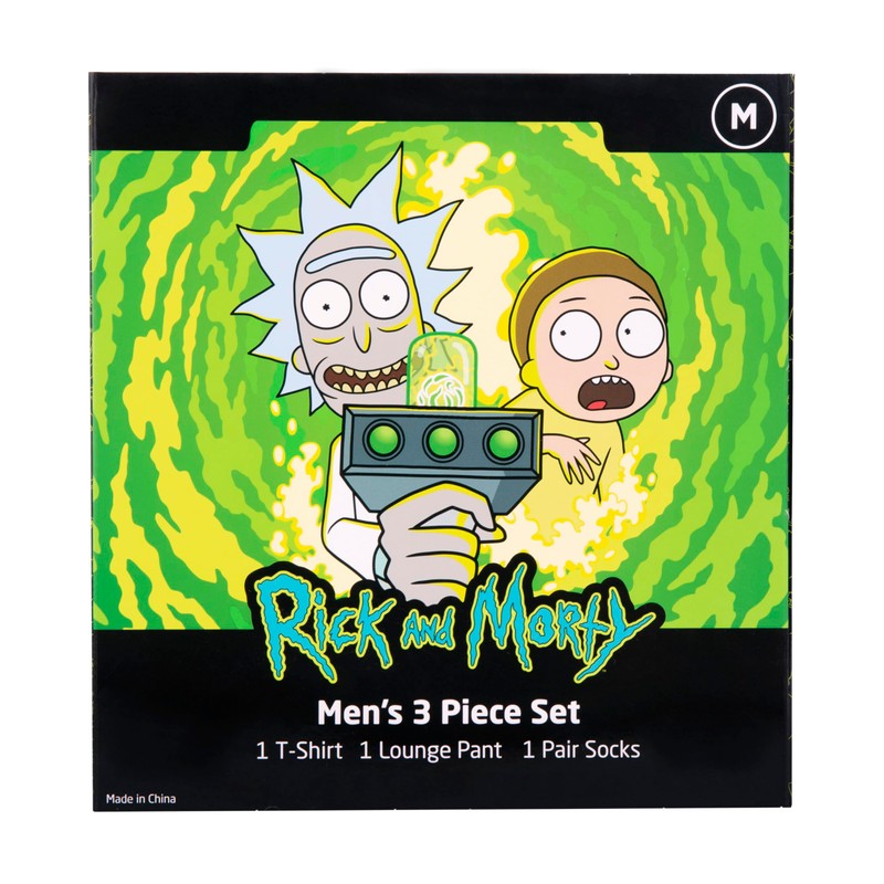 - This Rick and Morty lounge set is perfect for fans of the hit animated series. The set includes a comfortable tee shirt, lounge pants, and matching socks, all featuring your favorite characters like Rick, Morty, and Pickle Rick. With soft, breathable fabric, this set ensures comfort for lounging or casual wear.