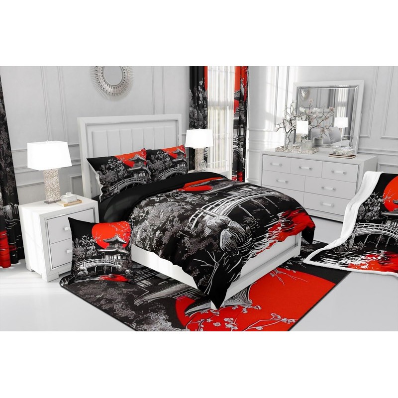 Loussiesd Japanese Ukiyoe Duvet Cover Set Single Size For Kids Boys Girls Adults Japanese Style Bedding Set Red Sunset Comforter Cover with 1 Pillowcase Hokusai Pattern Beds Set