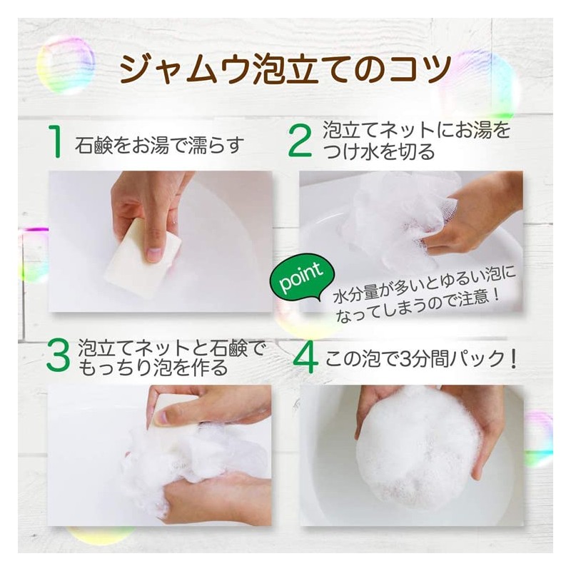 - (3 Minutes Foam Pack Care) Use a foaming net, etc. to lather the jam soap with cold or hot water, and apply plenty to any area you are concerned about and use the foam pack for about 3 minutes. Just add a foam pack for 3 minutes of jam to your daily bath time, and you can take care of your skin while moisturizing the odor or old exfoliate. Gives an impression that is unique to a woman