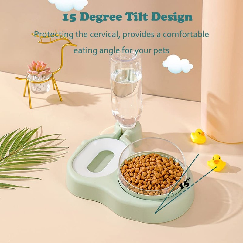 Love Dream Pet Feeder, 2-in-1 Double Bowls with Automatic Drinking Bottle, Tilted and Rotatable Design for Cats and Dogs, BPA-Free and Easy to Clean